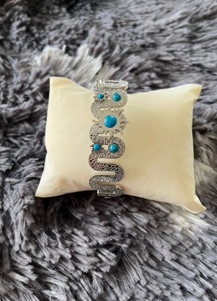 Gümüş renkli Güneş ve Yılan Desenli Turkuaz Bileklik