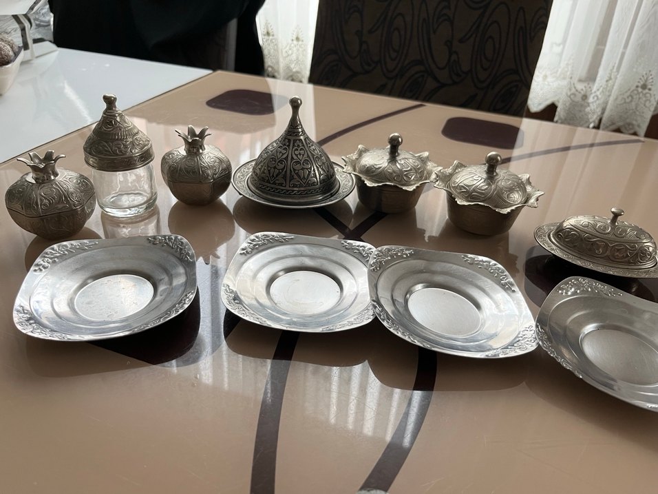 İşlemeli desenlere sahip gümüş renkli çay tabakları , kapaklı lokumluklardan oluşan set. Toplam 11 parça Geleneksel sunum için uygun. ☕