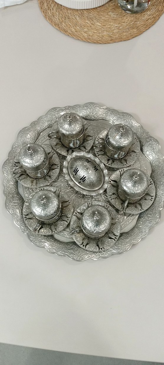 İşlemeli gümüş renkli kapaklı kahve fincanları ve tabakları, süslü yuvarlak tepsi üzerinde düzenlenmiştir. ☕