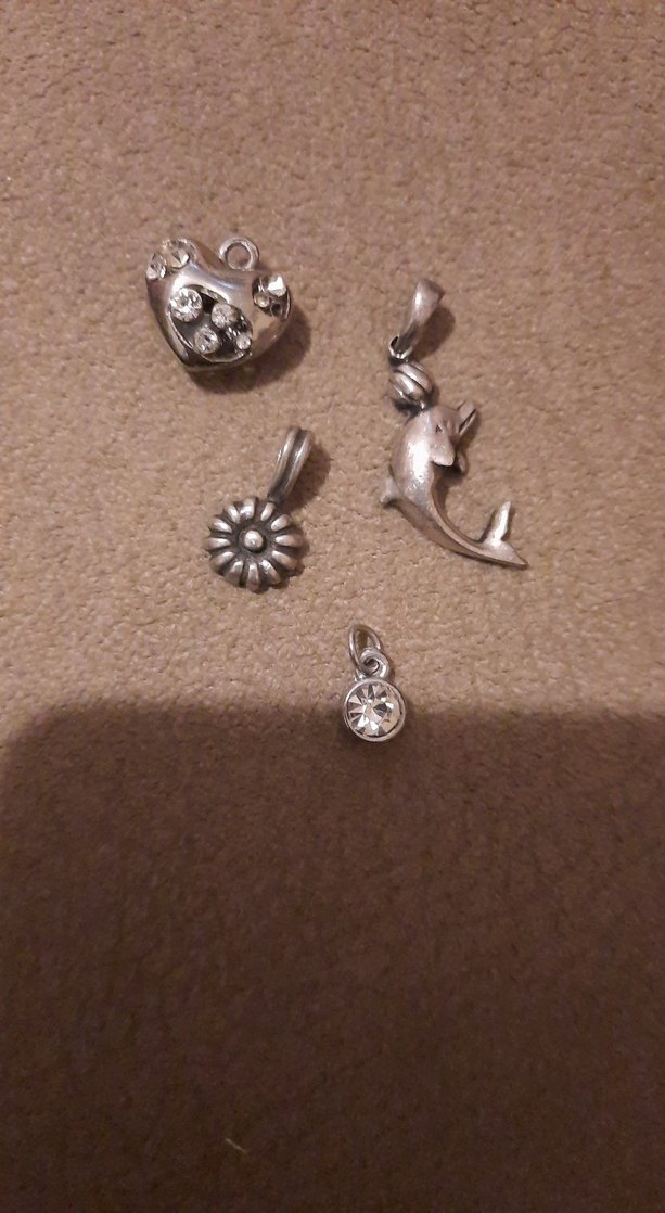 Gümüş renginde, payetli ve vintage esintili kadın charm seti. Kalp, yunus, çiçek ve kristal detaylı, günlük kullanıma uygun.