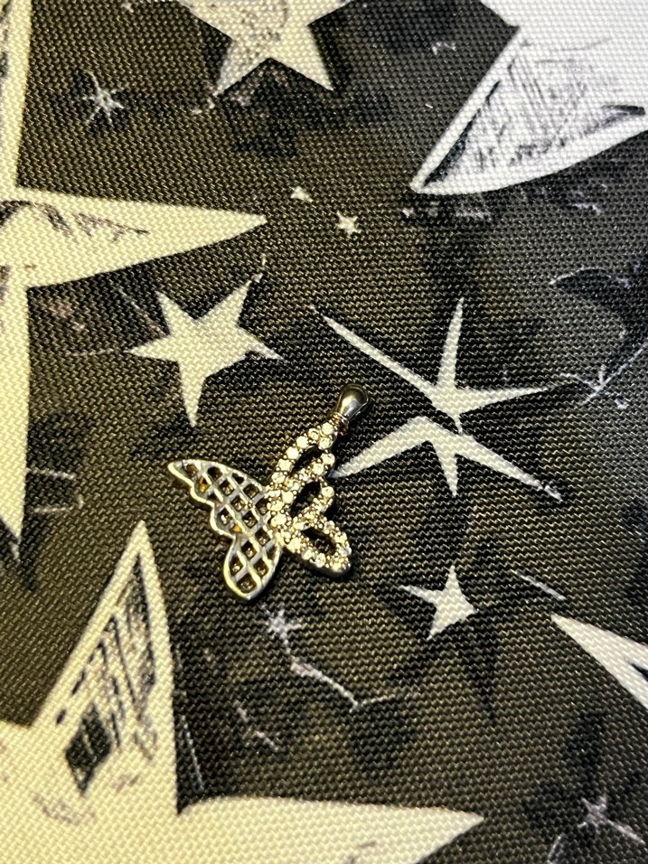 Pul işlemeli, kelebek figürlü gümüş renkli charm.