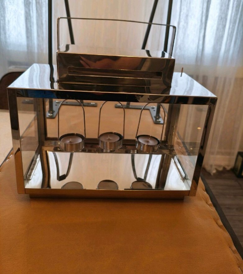 Cam panelli, üç tealight mumlu, taşınabilir saplı bej metal mumluk. ️