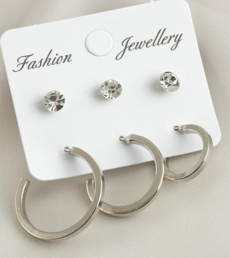 Gümüş renkli midi halka küpeler ve küçük kristal küpelerden oluşan set, modern klasik ve minimalist tarzda, günlük kullanıma uygundur. ✨