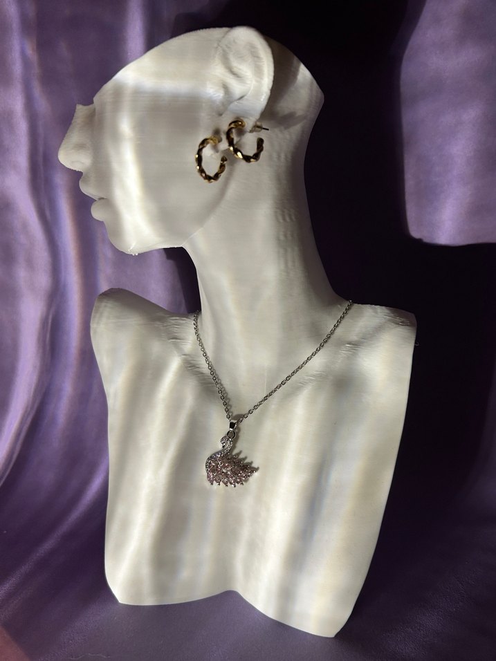 Parlak gümüş renkli, kuğu desenli kolye, günlük kullanım için uygun.