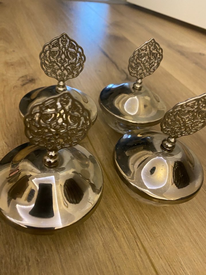 Parlak gümüş renkli, soyut desenli ve zarif süslemeli sapları bulunan hediyelik takım.