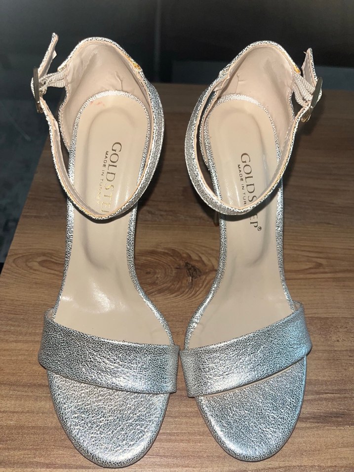 Gümüş renkli, tokalı ince topuklu kadın abiye ayakkabı. Yılan derisi desenli, suni deri malzemeden üretilmiştir. Düğün ve özel geceler için uygundur. 1 kez giyildi. 37 numara fakat kalıbı dar. 36 numara uyumlu.