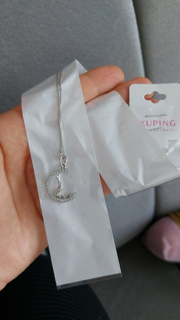 Gümüş renkli zincir detaylı kolye, ay şeklinde taşlı bir kolye ucu içerir. Minimalist ve günlük kullanıma uygun. Marka: Kuping Jewelry.