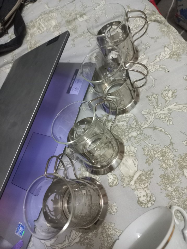 Gümüş saplı, desenli cam bardak seti, çay veya kahve servisi için uygundur. ☕
