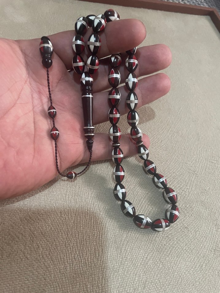 Bordo renkli, koyu tonlarda ve bohem tarzda erkek tesbih boncukları. Geleneksel görünümlü detaylı boncuk desenleri içerir.
