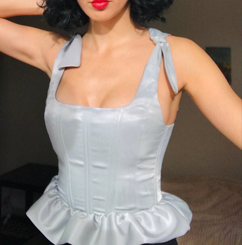 Gri saten dokulu, fırfırlı etek uçlu ve arkadan bağlamalı vücuda oturan korse büstiyer. Parti için uygun, gotik tarzda.
