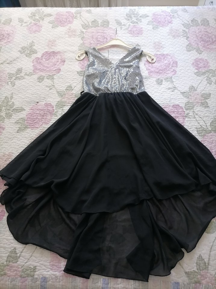 Önü kısa arkası uzun gümüş siyah renkli elbise. xs beden elbise ama 36 bedene uyar.