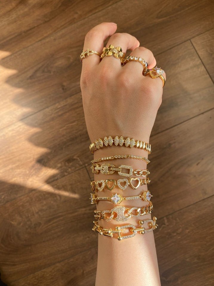 Altın renkli boncuklu ve zincir detaylı bileklikler, günlük kullanım için bohem ve göz alıcı bir stil sunar. ✨ halhallar 150 TL (adet fiyatı) bileklikler 250tl (adet fiyatı) Şahmeranlar 170 TL (adet fiyatı)