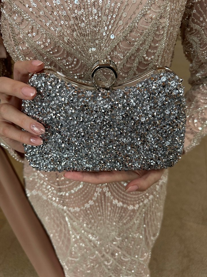 Gri renk işlemeli ve payet detaylı, sentetik kumaştan modern kadın portföy çanta, düğünler için uygun. ✨