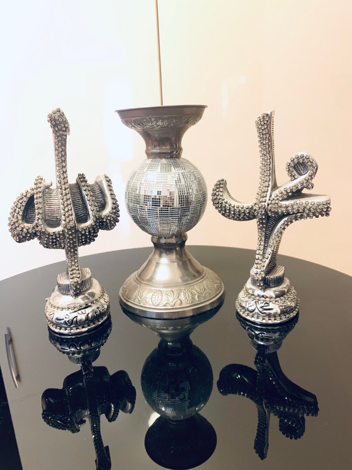Hiç bir kusurları yoktur. Sadece dekoratif olarak vitrinde durmuştur. Taşlı şık ve ağır ürünlerdir. Üç adet fiyatıdır