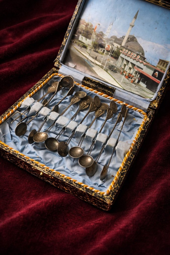 Antika kaşıklar, tarihi şehir fotoğrafı bulunan süslü kutuda düzenli şekilde yer alıyor.