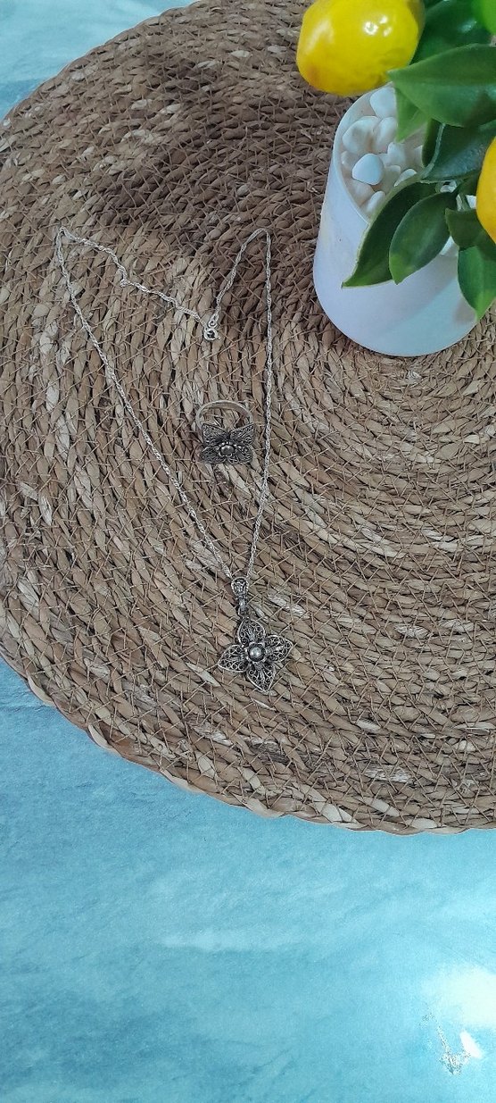 Gri renkli, çiçek desenli ve zincir detaylı bohem tarzı gumus 925 ayar kolye yuzuk