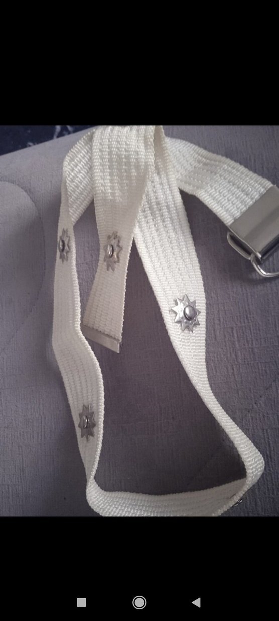 Gümüş tokalı ve yıldız şekilli gümüş süslemeli, dayanıklı sentetik kumaştan yapılmış beyaz kadın kemeri.