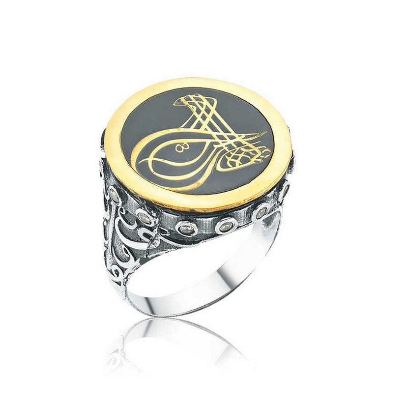 925 ayar gümüşten imal edilmiştir. Tuğralı yüzük gümüş üzerine oksit kaplama yapılmıştır.Tüm gümüş erkek yüzüklerde olduğu gibi gümüş tuğralı erkek yüzüğünde tamamı el emeği ile üretilmiştir. Gümüş ve değerli taşlar nedeniyle belirtilen ortalama ürün ağırlığında ± %10 sapma olabilmektedir. Ort. Ağırlık: 17.00 gr. Ölçüler:18-24