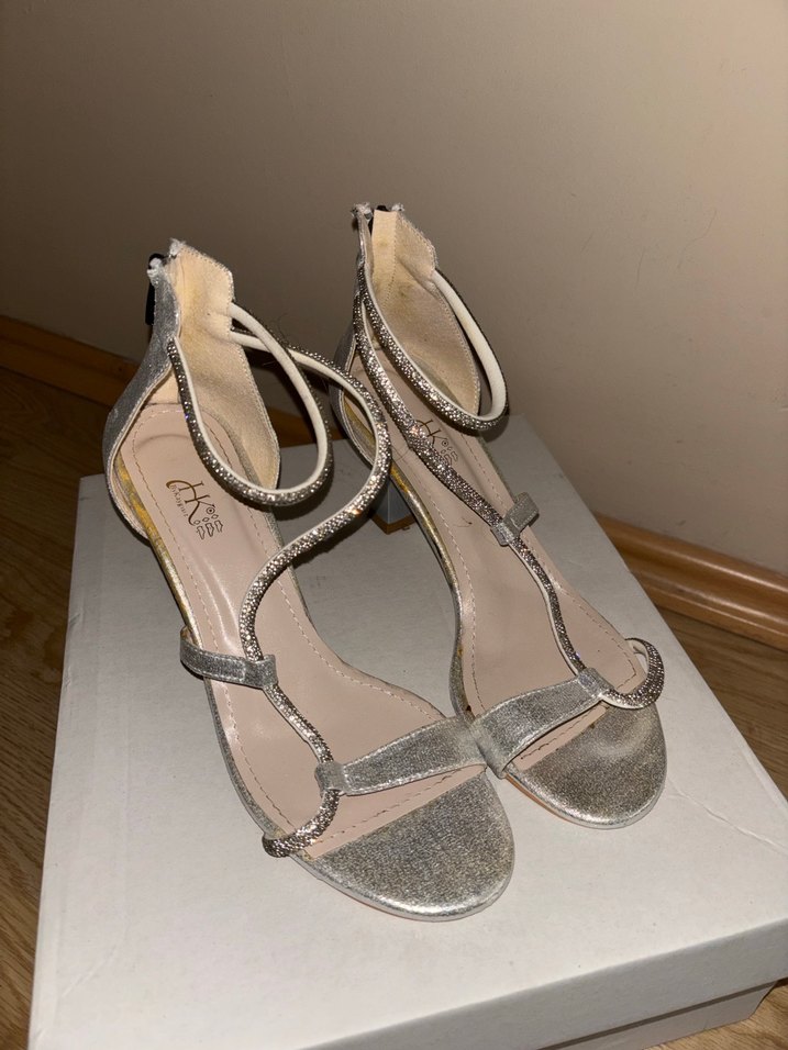 Tokalı bantlara sahip gümüş yılan desenli stiletto. Düğünler için uygun. Sadece bir kez mezuniyetimde giydim.