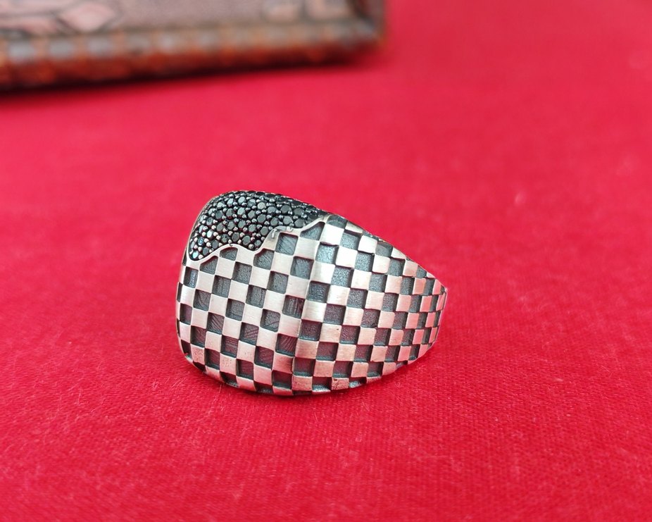 925 ayar gümüş mikron taşlı damalı model yüzük