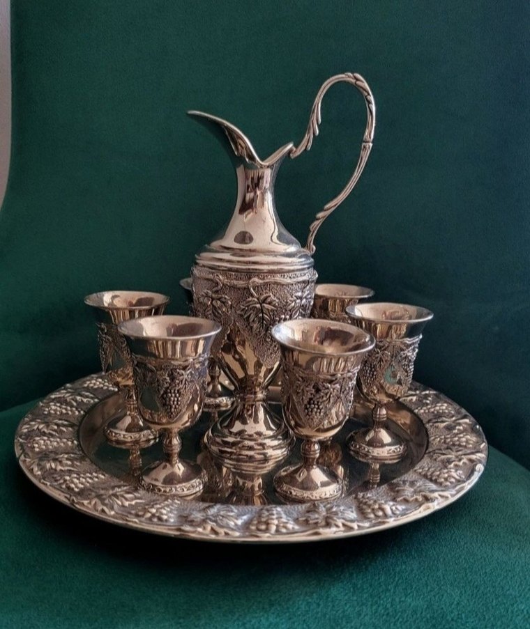 Gümüş sürahi ve altı adet bardak, işlemeli detaylı tepsi üzerinde yer almaktadır. zemzem takımı olarak kullanılabilir
