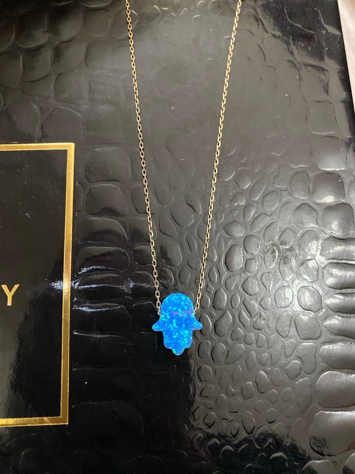 Gümüştür patenti var fotoda biraz kararmıştır ama parlatılır Uzun zincirli, turkuaz renkli hamsa figürlü kolye. Minimalist tasarımı bohem ve retro stillerle günlük kullanıma uygundur.