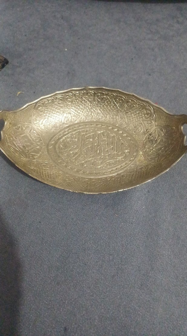 Her iki yanında kulpları olan, yılan desenli ve detaylı işçiliğe sahip parlak gümüş renkli tepsi.