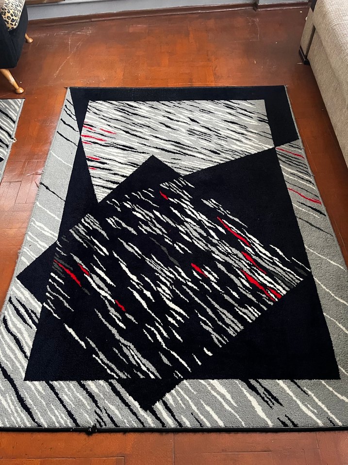 Bu modern halı, siyah ve gri tonlarında soyut desenlere sahip olup, hafif kırmızı detaylarla odanıza çağdaş bir dokunuş katar. Ölçüleri fotoğraflarda mevcuttur.