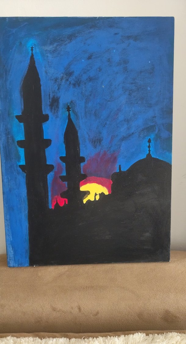 Karanlık mavi gökyüzü ve çok renkli günbatımı arka planında cami silüetini gösteren tablo.