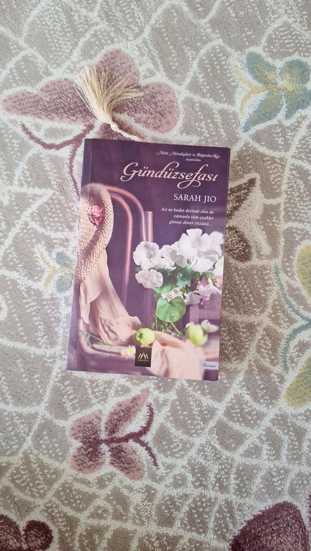 Sarah Jio'nun "Gündüzsefası" romanı, duygusal ve unutulmaz hikayeler sunuyor. Kitap kapağında çiçek ve vintage görseller var.