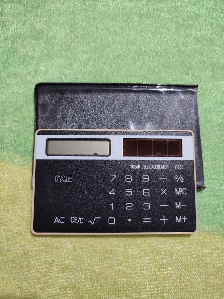 Güneş enerjili siyah hesap makinesi, ince tasarımlı ve net ekrana sahip. Temel aritmetik, hafıza ve yüzde fonksiyonları içerir. Koruyucu kılıf ile birlikte gelir. pili bitik durumda