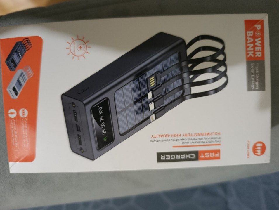 Bu siyah power bank, güneş enerjisiyle şarj olabilen ve birden fazla çıkış portu bulunan taşınabilir şarj cihazıdır. 30000 wat
