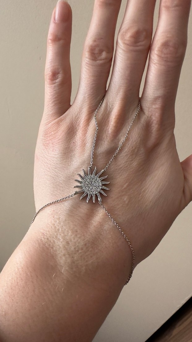 Güneş figürlü detaylı kolye ucu ve ince zincirden oluşan bohem tarzda el zinciri, retro ve hippie esintili, günlük kullanıma uygun. ☀️