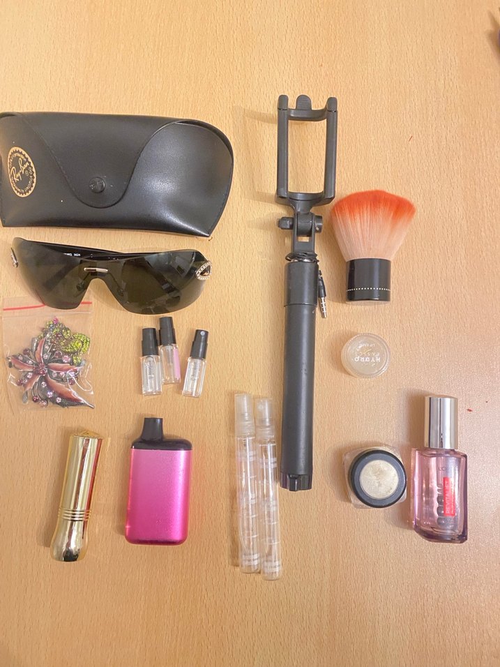 Makyaj fırçası, selfie çubuğu, gözlük ve kılıfı, küçük parfüm şişeleri, siyah göz kalemi, göz simli far ve göz serum