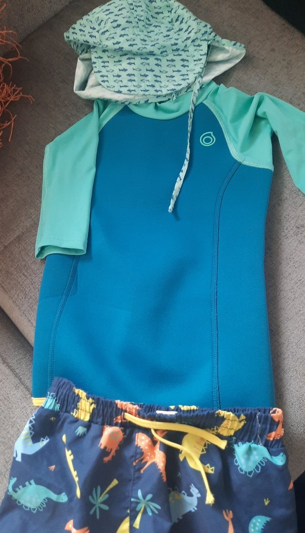 Turkuaz renkli, uzun kollu erkek çocuk mayo üstü. Altında renkli dinozor desenli yüzme şortu bulunur. şapkada güneş koruyucu şort LCW