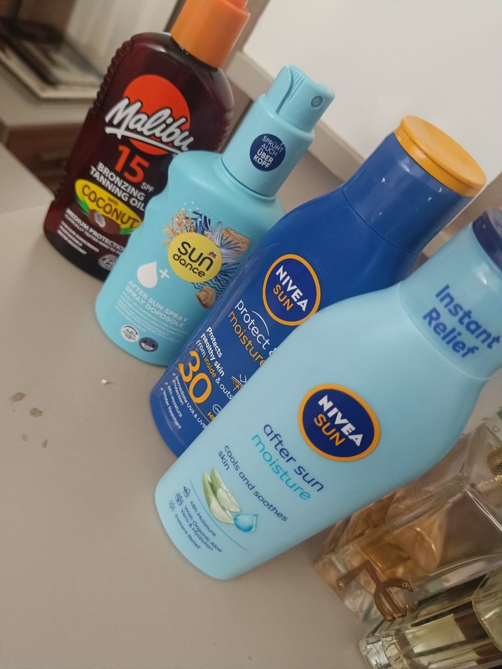 SPF 15 ve 30 güneş koruyucular, nemlendirici after sun losyonu ve hindistancevizi özlü bronzlaştırıcı yağ içeren güneş bakım seti. çok az kullanıldı