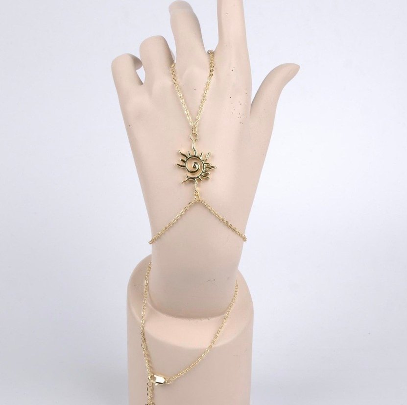 Altın renginde, güneş figürlü ve ince zincir detaylı bohem tarzda kadın el aksesuarı. Günlük kullanıma uygundur. ☀️