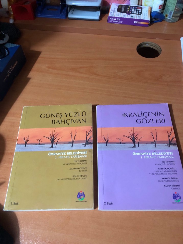 Ümraniye Belediyesi 1. Hikaye Yarışması kapsamında yayımlanan "Güneş Yüzlü Bahçıvan" ve "Kraliçenin Gözleri" adlı iki hikaye kitabı. Yumuşak kapak, kapaklarında çizimler bulunuyor. 2 adet kitap