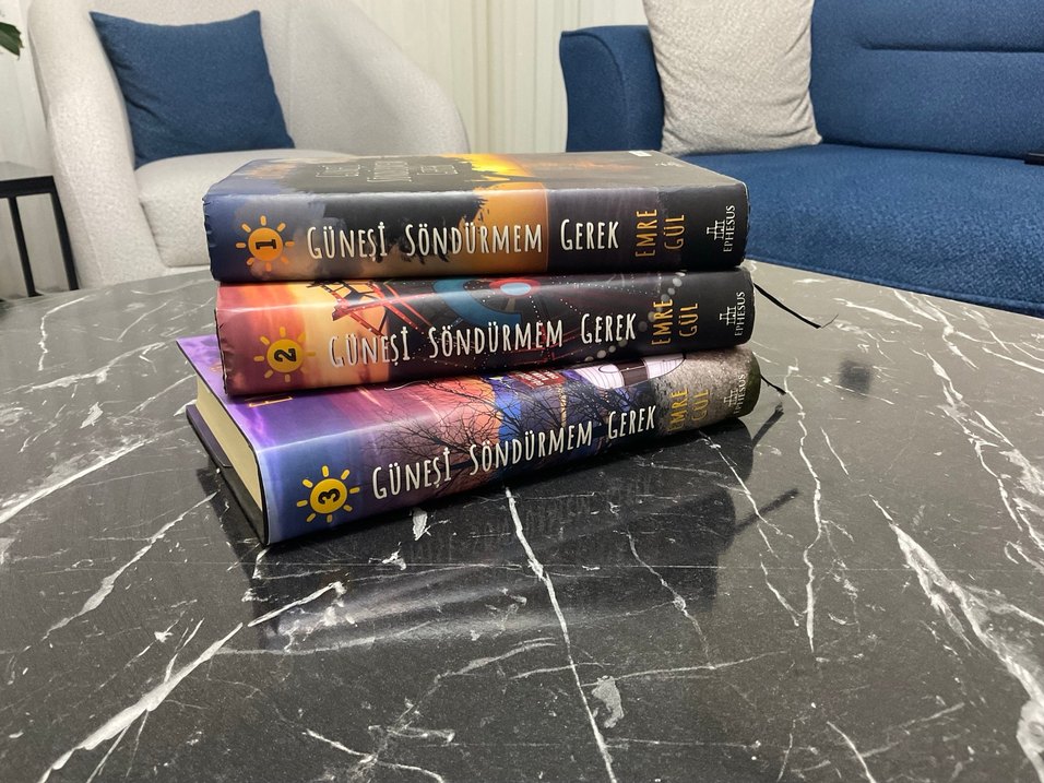 Emre Gül'ün yazdığı "Güneşi Söndürmem Gerek" adlı roman serisinin 3 ciltlik seti, her kitap farklı kapak tasarımına sahip.