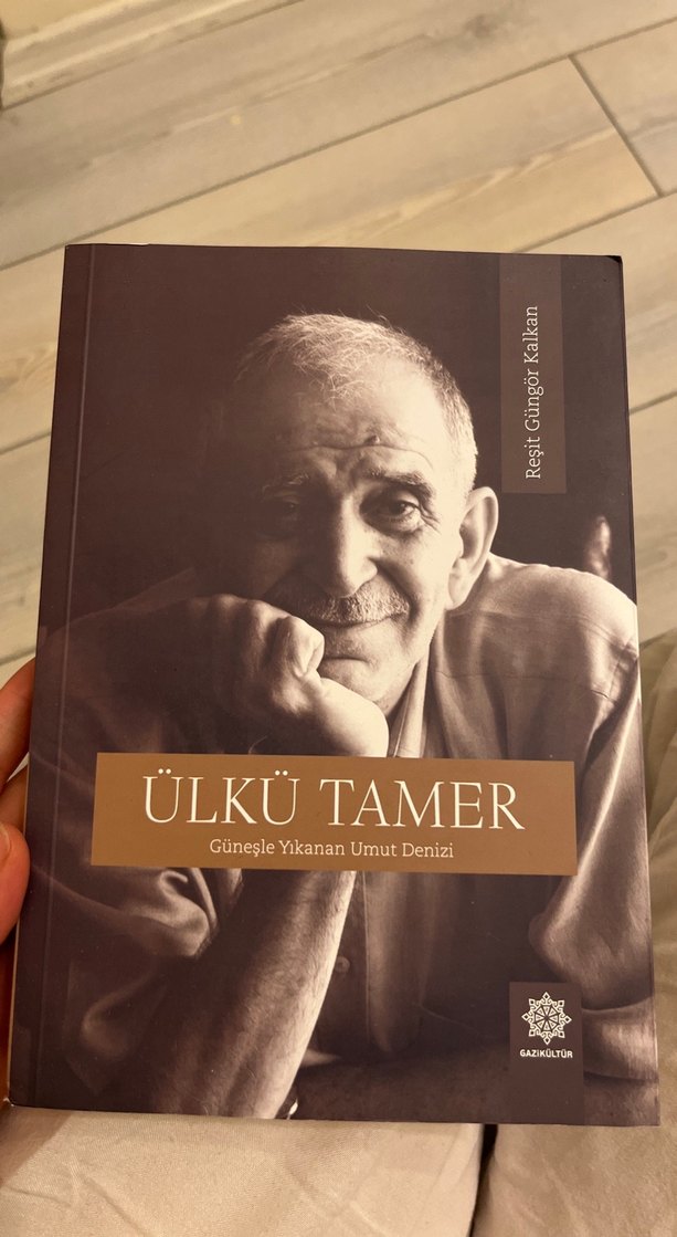 Ülkü Tamer'in "Güneşle Yıkanan Umut Denizi" adlı romanı, insan duygularını ve yaşam deneyimlerini derinlemesine işler. Kapakta yazarın düşünceli portresi yer alır.
