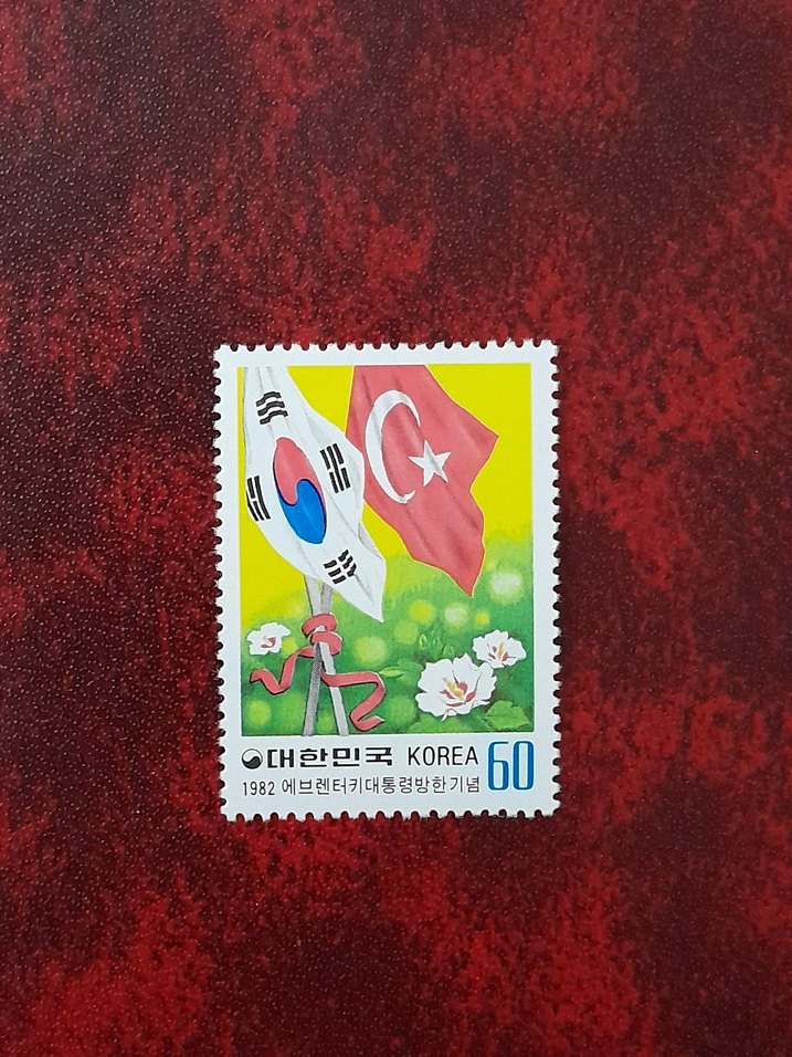 1982 tarihli, Güney Kore ve Türkiye bayraklarının yer aldığı DAMGASIZ PUL