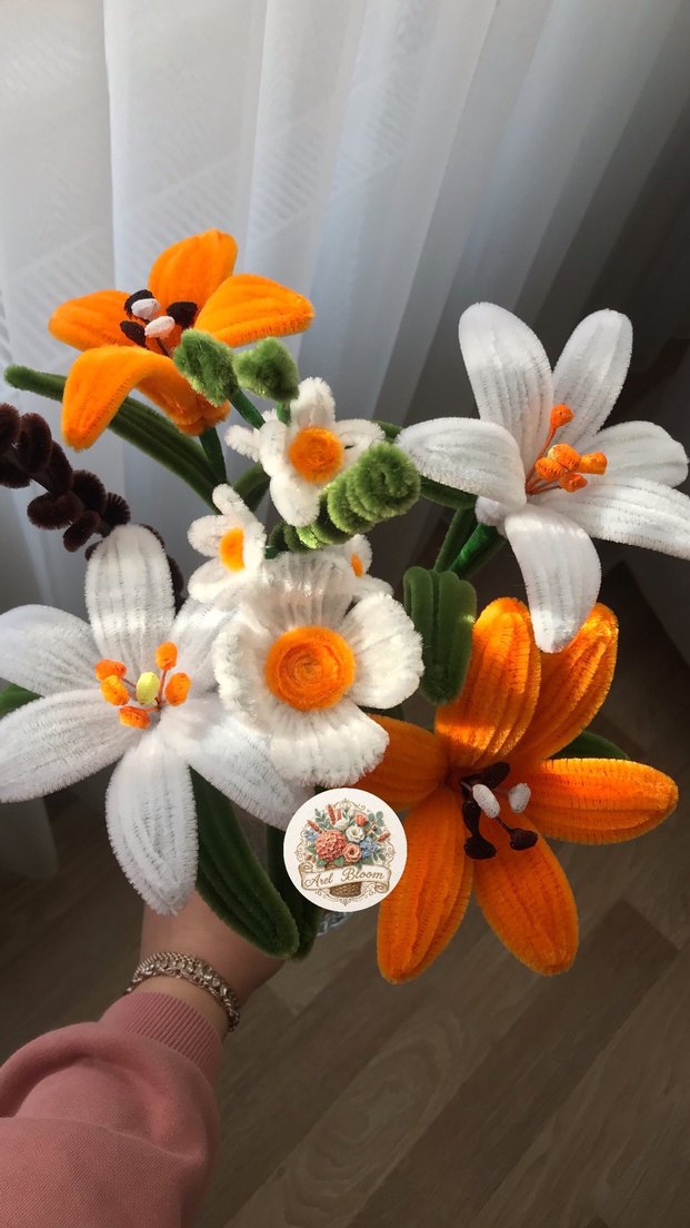 Turuncu ve beyaz renklerde, yumuşak dokulu malzemeden el yapımı bohem tarzda çiçek buketi.