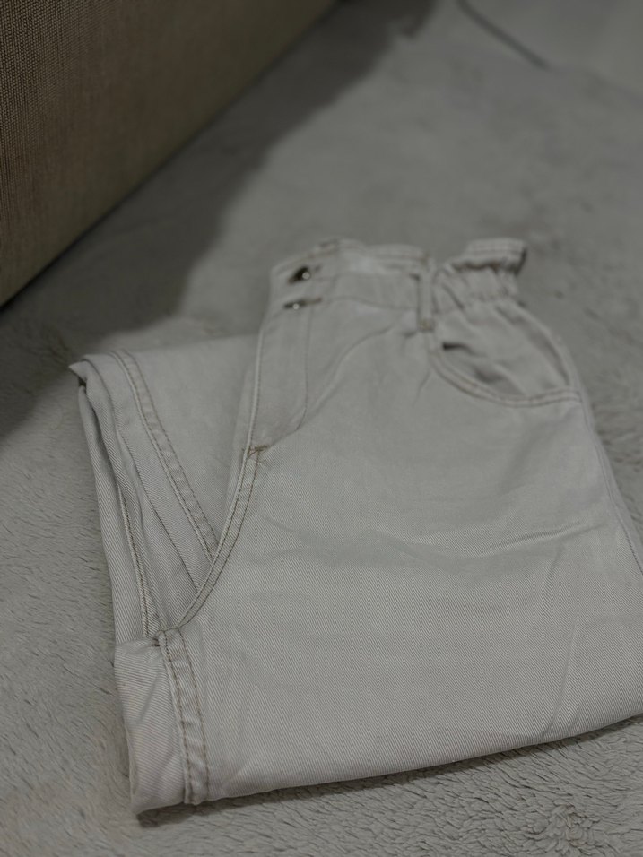 Salaş kesim, bej keten kumaştan yapılmış, günlük kullanıma uygun rahat kadın pantolonu. Temizdir