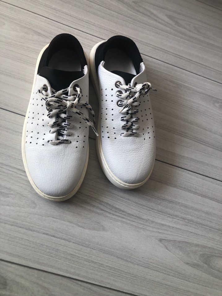 Beyaz, delikli tasarıma sahip kadın spor ayakkabısı, rahat kullanım için kauçuk tabanlıdır. Sokak stiline uygun, zahmetsiz şıklık sunar.
