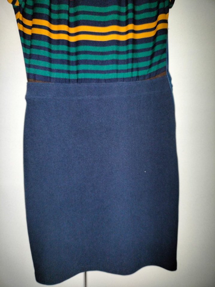 Konforlu sentetik kumaştan, çizgili pilili detaylı ve koyu mavi renkte, ofis ve günlük kullanıma uygun dar kesim