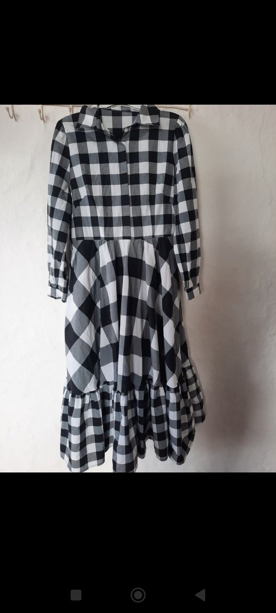 siyah beyaz ekosel desenli elbise cepli gömlek ,yaka kemeri ,yok üst tarafı düğmeli gizli düğme alt kısmı fırfırlı rahat kalıp günlük Kullanıma Uygundur kumaş tipi gabardin polyester karışımlı Sanırım ya da poplin kumaş temiz defosuz kusuru yok yeni gibi beden bilgileri boy 122 cm en cm 45 cm