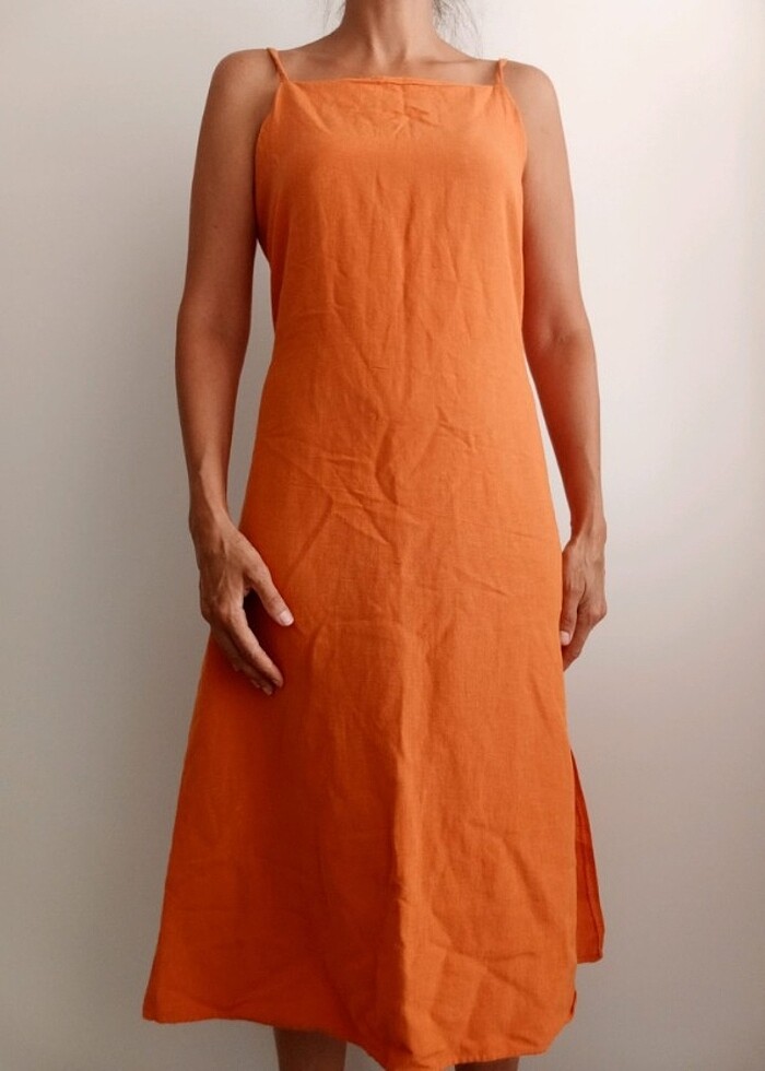 Askılı keten kumaş sağ yandan dizden bir karış üzerinde yırtmaç mevcut elbisenin uzunluğu dizden bir karış altında arkası fermuarlı