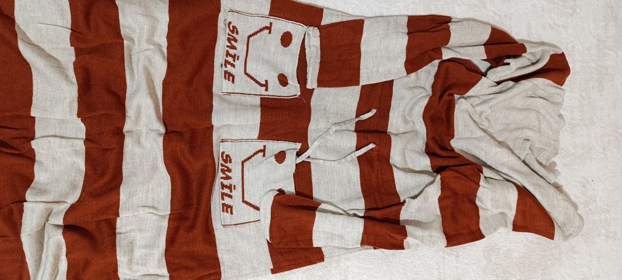 Kahverengi ve gri renklerde, üzerinde "SMILE" yazılı ve gülümseyen yüz baskısı