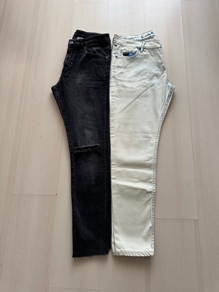 Günlük kullanım için uygun, regular fit siyah denim pantolonlar. Rahat ve şık bir stil sunar. Açık renk catch marka olanın beli 46 cm boy 100 cm paça 16 cm dir.H&M olan koyu grinin beli 44 cm likralı 46 cm e esniyor boy 100 cm paça 16 cm dir ikili fiyattır.