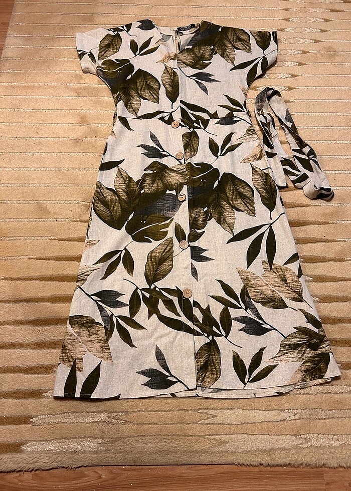 Marka temsili. V yaka , beli kendinden kemerli . düğmeler sabit, arkası fermuarli. Omuzdan boy 114 , bel 76 cm